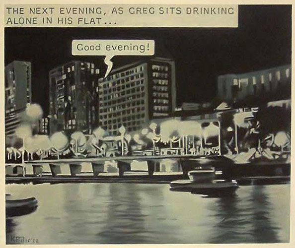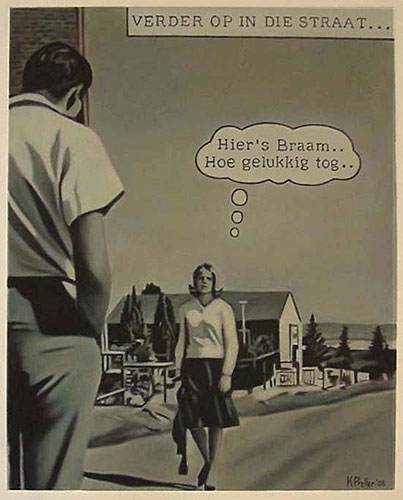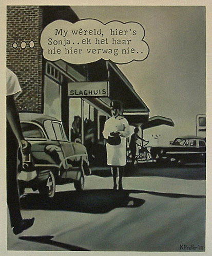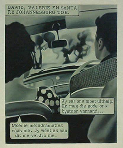 Apart from rendering the clichéd strange, Karin Preller’s work derives its haunting power from isolating frames from the flow of narrative and plunging the viewer into uncertainty. The viewer, accustomed to the conventions of plot, is fundamentally unsettled by frustrated expectations. The images following-on and preceding refuse to reveal if the meeting with Braam was incidental, the motorical moment or the resolution of a love affair, an isolated incident or a drawn out accident. We are not sure what to make of the information presented to us. As characters in the source material, the figures were exasperating, and as actors, limited in their range. Now rendered in paint, they are vulnerable in their unknowingness. The most throwaway scene becomes poignant.