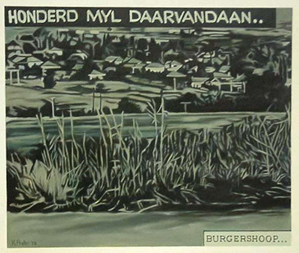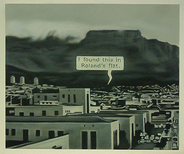 There is an eeriness to the so-called natural features and cityscapes, twice removed and mediated, the first time by functioning as props in pulp fiction and now painstakingly rendered in paint. The theatrical, stilted gestures of white actors, so carefully painted, evoke sleepwalking. Are they perhaps the living dead? The images remind me of the historical coincidence that Abba’s ‘Fernando’ was number one on Springbok Radio’s hit parade in the week of the Soweto uprising.