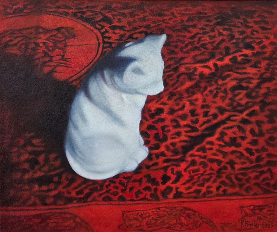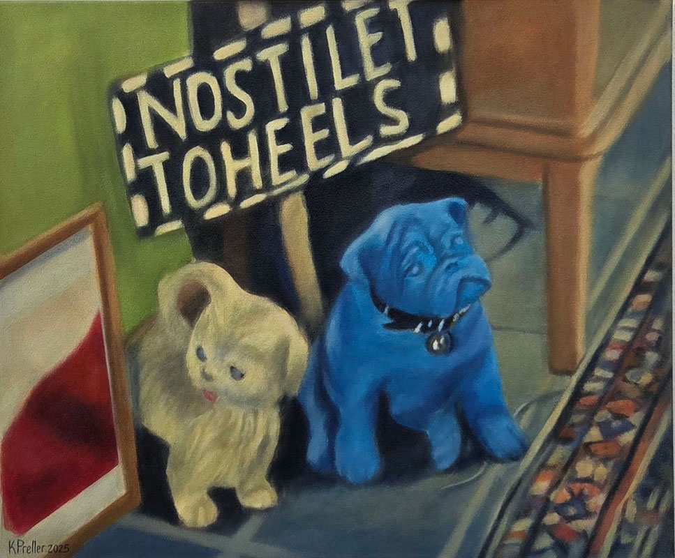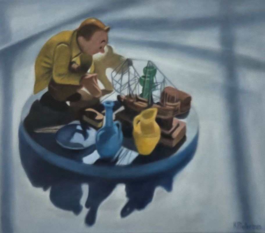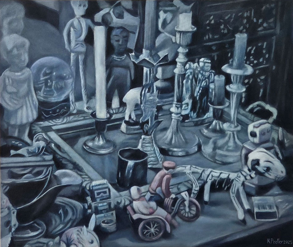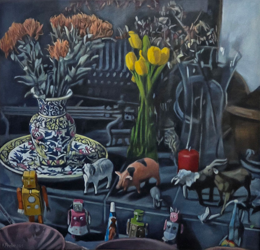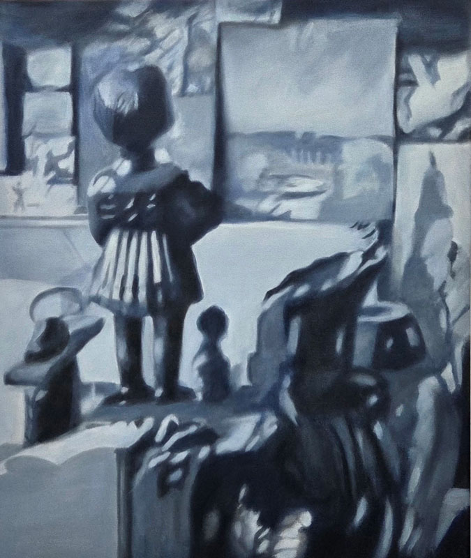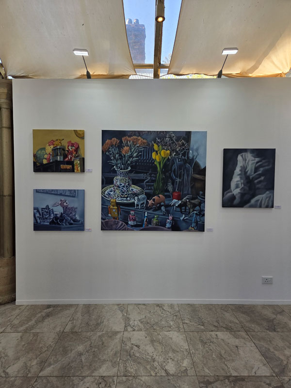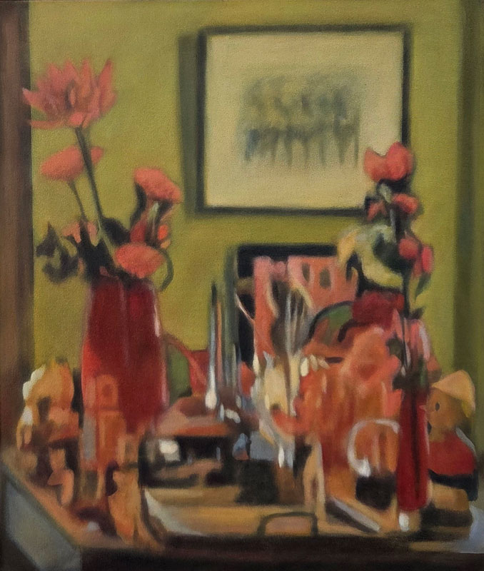 In this exhibition I return to still life, an enduring interest. Most of the objects depicted are either my own or those displayed in a friend’s house, photographed and archived over many years. While at first glance evocative of the phenomenon of the cabinet of curiosities, the paintings invite reflection beyond their deceptive simplicity, to conversations that might be opened up by the objects in each painting and the paintings in relation to each other. The objects bear mute witness to their surroundings, remote from that which falls outside their confined spaces.
