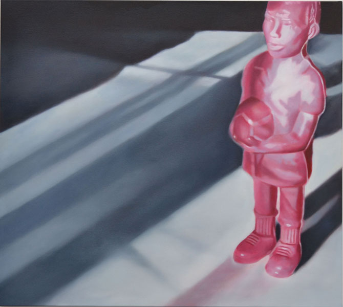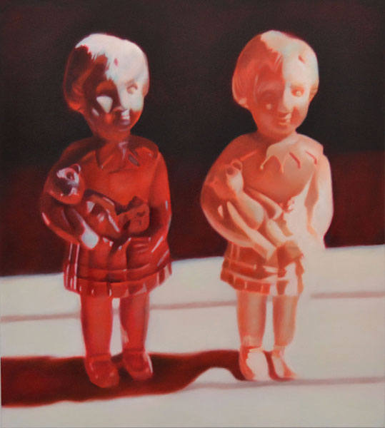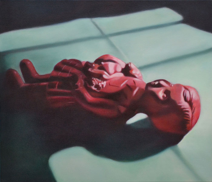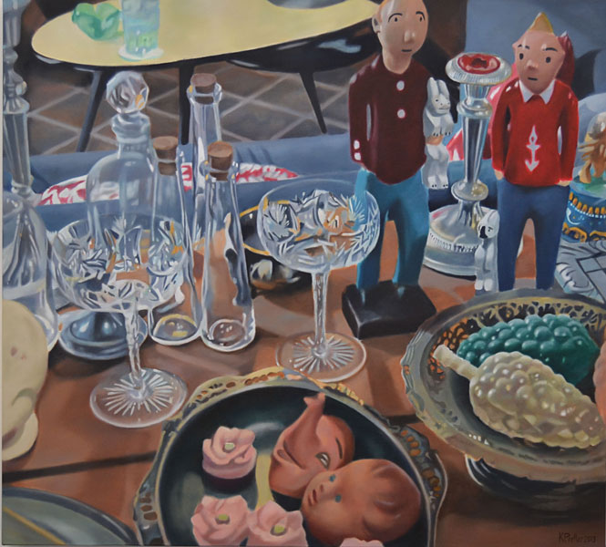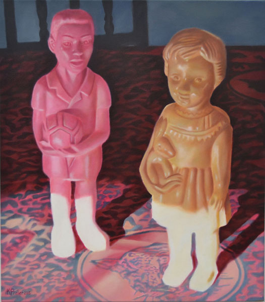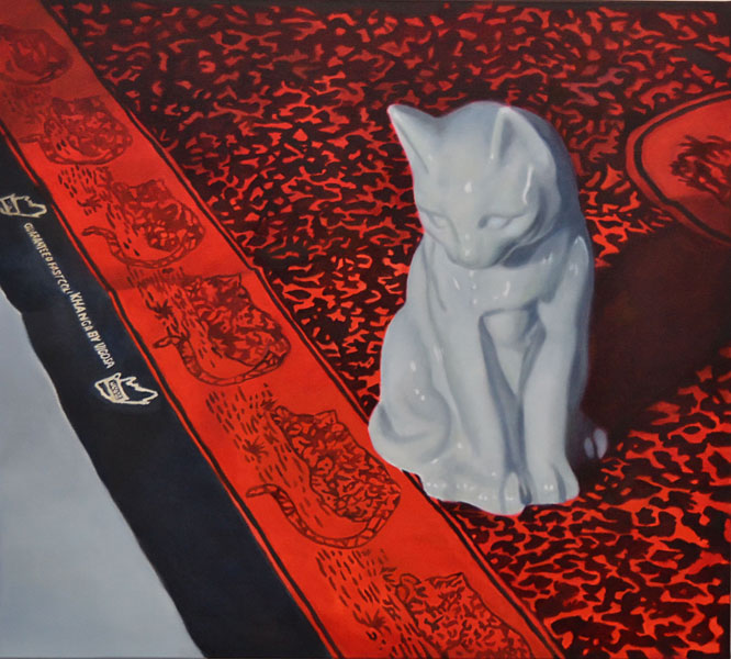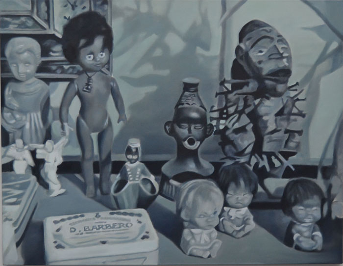 Most of the objects depicted form part of a collection displayed in a friend’s house, others are Preller’s own. Acquired and treasured over time, they become shrines to existence; repositories of memory and obsession, at once eerie and often humorous; testaments to the stories of their owners or those to whom they once belonged. The apparent randomness of collection and display unintentionally strike a web of relationships, the objects becoming carriers of meaning beyond those initially attributed to them, either because of their isolation or because of strange juxtapositions made visible in paint.