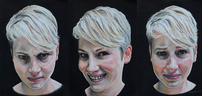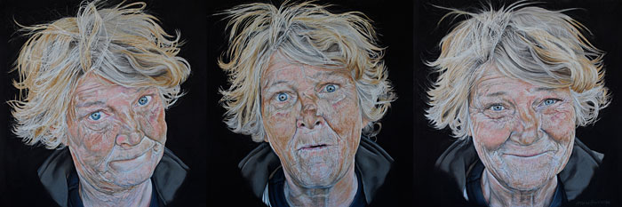 The exhibition “Surface” is compiled of a series of large to medium sized full colour pastel portraits - some on back grounds of black enamel, a series of smaller oil portraits in black and white and a number of monochrome portrait profiles in oil on dinner plates with back grounds of coloured enamel. The combination of a velvety powder pastel with a high gloss enamel has a curious effect of making the portrait 'jump out' from the surface. Another strange feature of this body of work is the “sketchy” quality of the monochrome oils reminding us of charcoal drawings compared to the rich, densely covered full colour surfaces of the pastel drawings, reminding us more of oil paintings than drawings.