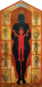 While I lived in New York from 1981 to 2004, my longing for Africa often imaged the continent in the form a great dark mother. The mother’s body is the first landscape a newborn sees, so Africa with her mighty mountains, rivers, and grassy savannas, is the mother of my inner landscape. This African mother, along with her sisters, the black madonnas of Europe, with their deep European and ancient Middle Eastern roots, inform my work of unearthing/resurrecting/transforming a creative image of Mother, Woman, Sacred Earth. I add another dimension to the church’s contrivance of the madonna darkened by candle smoke or fire, by including for vindication those goddesses and biblical figures who have historically had their names blackened/darkened by misogynistic fears of powerful or willful women.