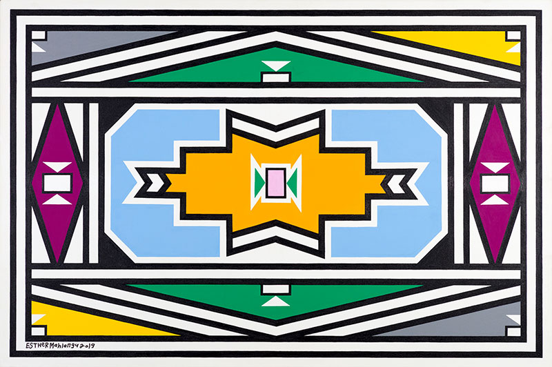 As one of South Africa's most acclaimed painters, Esther Mahlangu could be grouped with Agnes Martin, Monir Shahroudy Farmanfarmaian, Carmen Herrera, Saloua Raouda Choucair, Lucie Rie and Etel Adnan. Not only has Mahlangu been working in a minimalist abstract mode in the manner of this esteemed group of female artists, but she too has been making art consistently throughout her life and has remained active as an artist in her advanced years. This month the artist will turn 85 and to tie in with the occasion she will be launching the largest solo exhibition she has produced to date online and at The Melrose Gallery's Johannesburg branch. ![]() Untitled abstract work by Dr Esther Mahlangu produced in 2019