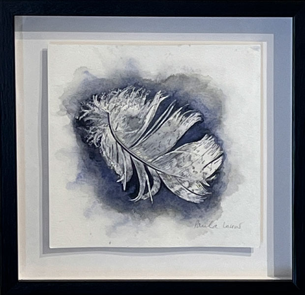 Artist:  Paula Louw Title:  Little Lives Series: Feather 3 Medium: Watercolour and ink on paper Size:  260 x 260mm Framed Price on Request