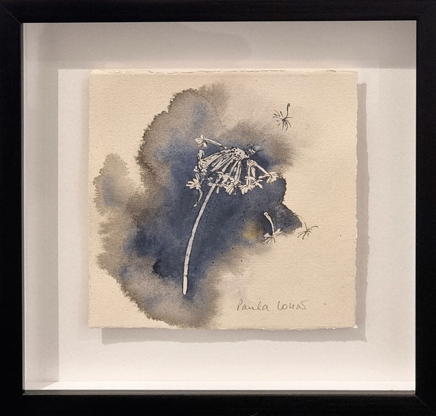 Artist:  Paula Louw Title:  Little Lives Series: Dandelion 2 Medium: Watercolour and ink on paper Size:  260 x 260mm Framed Price on Request