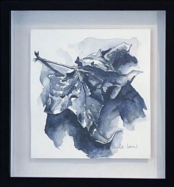 Artist:  Paula Louw Title:  Little Lives Series: Dry leaf 1 Medium: Watercolour and ink on paper Size:  260 x 260mm Framed Price on Request