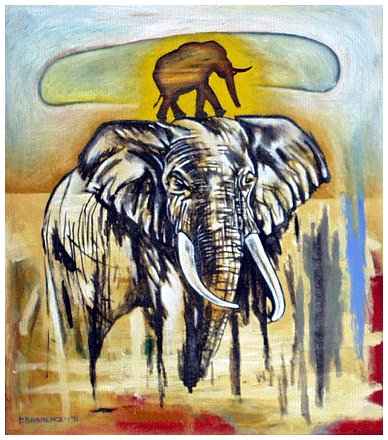 backdrop. He paints shrubs, animals - especially elephants - branches of thorn trees, a