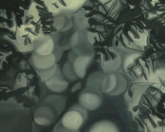 As one takes one's seat, the video starts to play and the panels, with details of interior and exterior scenes, come to life through the staggered choreography of an illuminating projector and video footage of light shimmering through leaves and branches. The blocks of light projected over the panels appear at first to be light boxes, flashing one by one, but when examined more closely, actually reveal themselves to be framed oil paintings. The “cadence” of their appearance - slowly, then quickly, then slowly again - follows the rhythm of a delicate piano piece composed in collaboration with Marelize Koch. An emotive mood is set as the video projection focuses first on single works and then flashes over a number of works as the music becomes more dramatic.