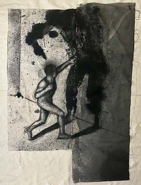 Ink, charcoal and red wool on raw canvas