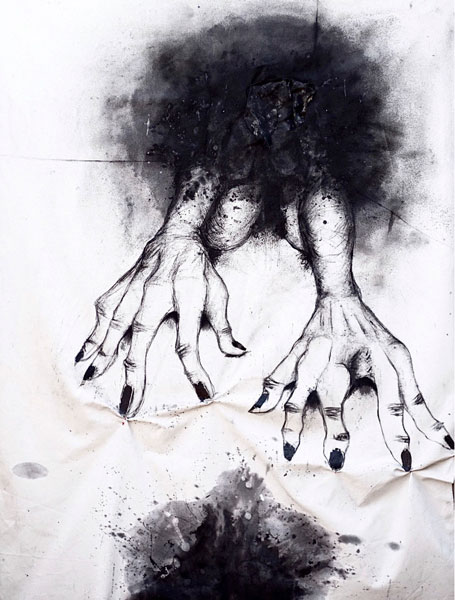 Ink, charcoal and red wool on raw canvas