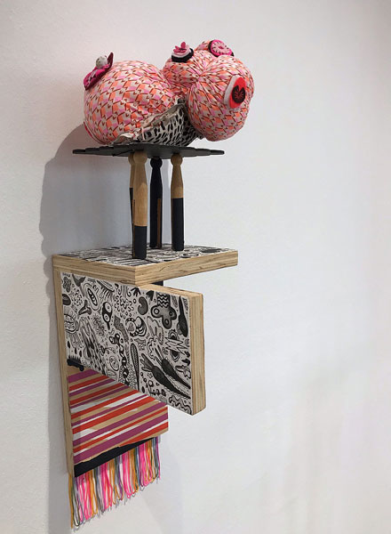 Artist:  Marlise Keith Title:  Ill News (2018) Medium: Soft sculpture, felt, embroidery thread, found objects, laser cut plywood & MDF, wooden pegs, found object, nails, fabric, Pigma Graphic & Micron pens. Size:  25 x 20 x 10 cm Price on Request