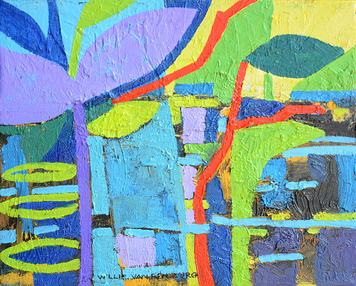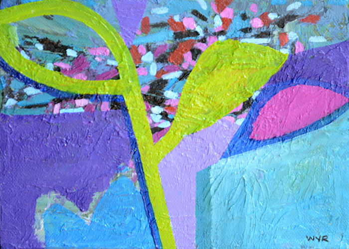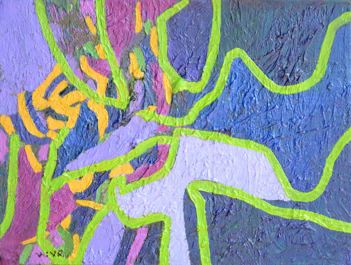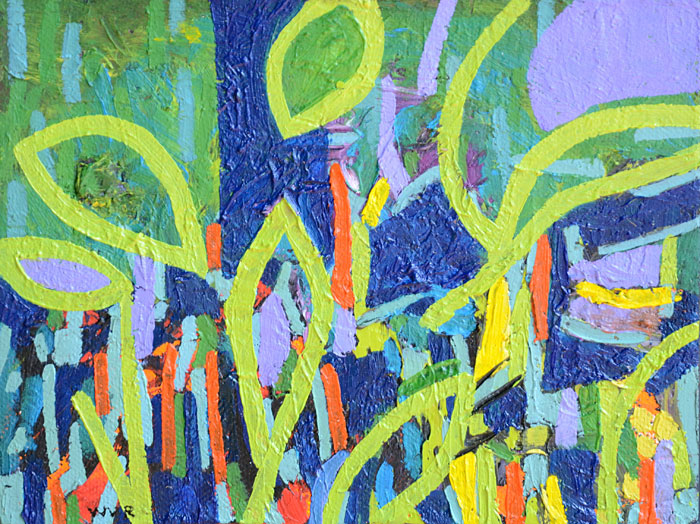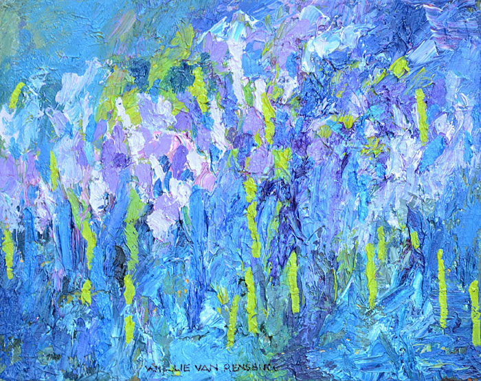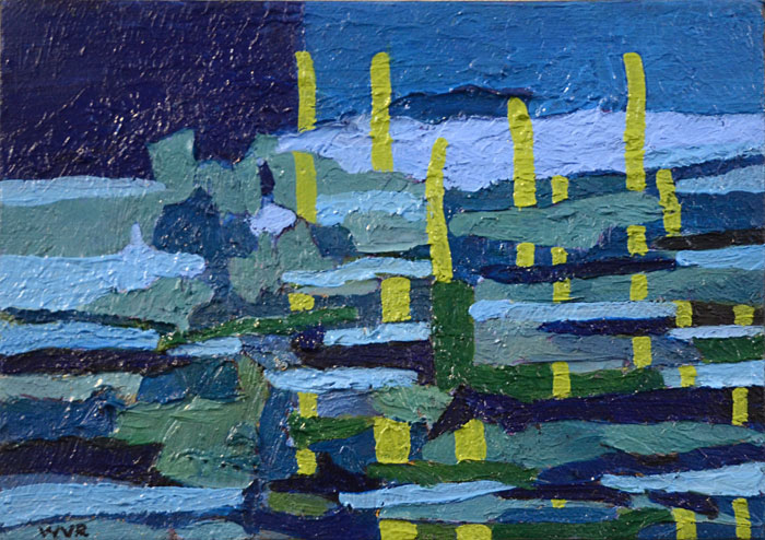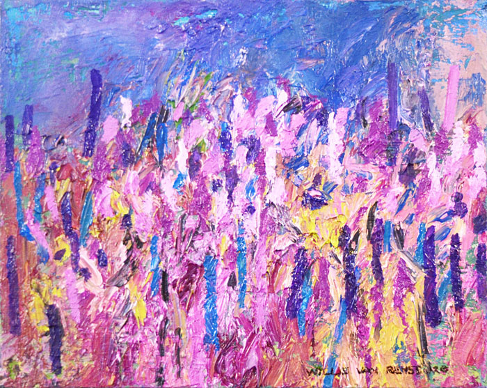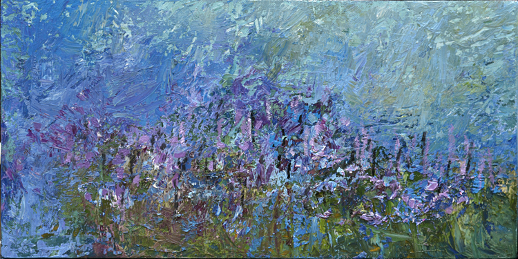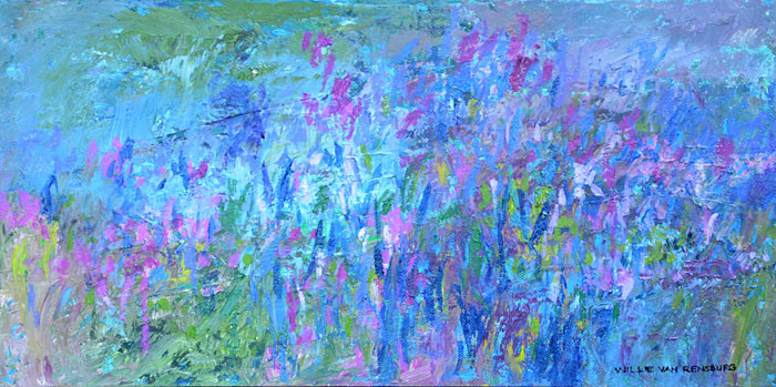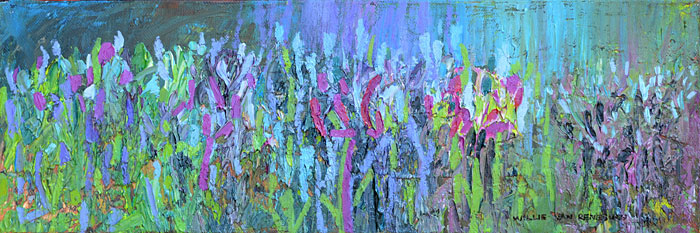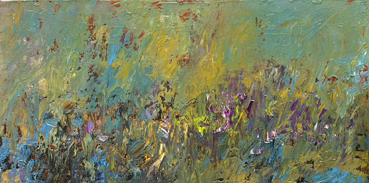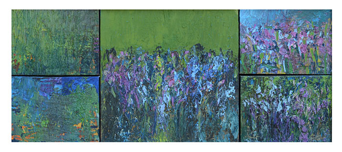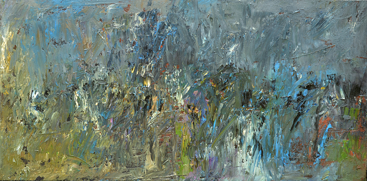 The call seems to be intrinsically related to the mesmerizing pattern of the vegetation. The plants weave in conscious unison, their life-hardy stems stretching upwards, directed and purposeful, while the tendrils of the imagination explore connectedness and contact. Thousands of individuated varieties thrive in the windswept valleys nourished by salty mists and nurtured by the boundless entanglement of being. Away from the contraints of time, there is a synthesis of intentions, a rhythmic meditative focus, an incantation which repeats the motif of the infinite in leafy interlocking hue. It is at this point that we sense before we see; it is the moment that the artist feels moved to capture the reflections on this dreamy threshold of awareness and make the invisible visible.